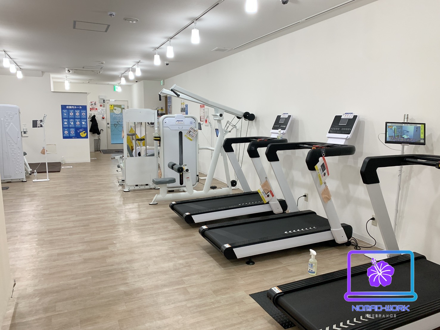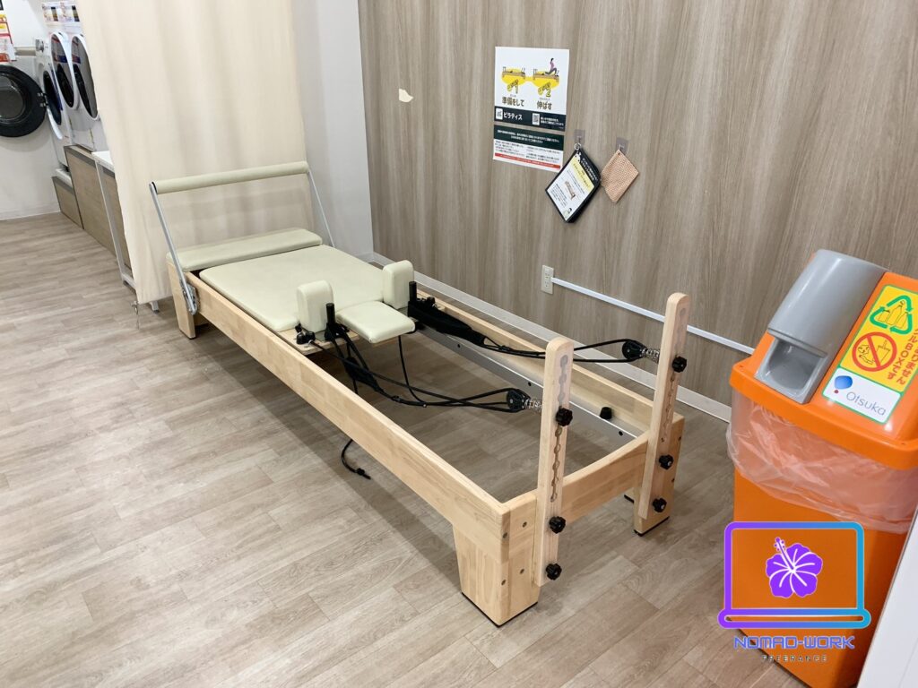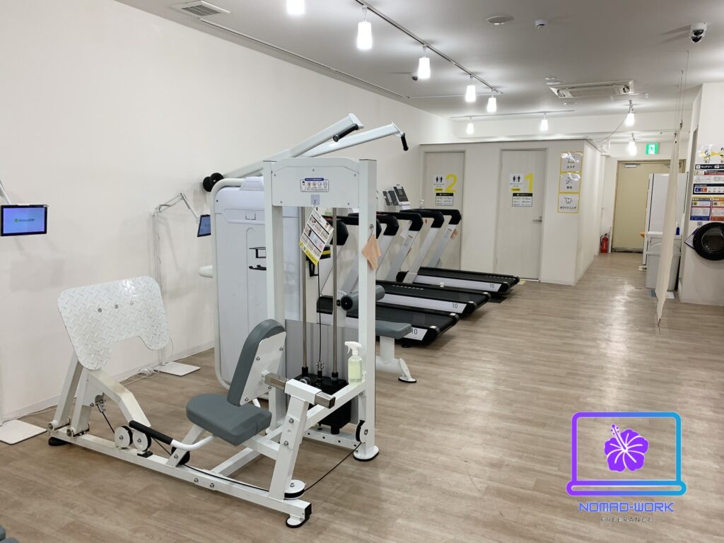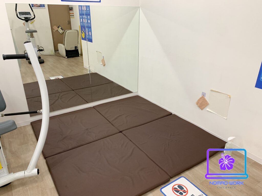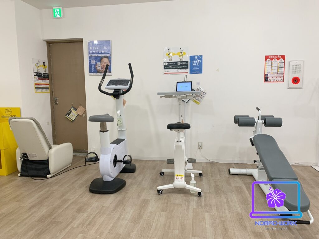ストレッチスペースの後ろにはマッサージチェアーがあります。その隣にバイク、デスクバイク、アブベンチが左から順にあります。サラリーマンが多い地域なのでデスクバイクは人気がありそうですね!使用感も問題なかったです。
