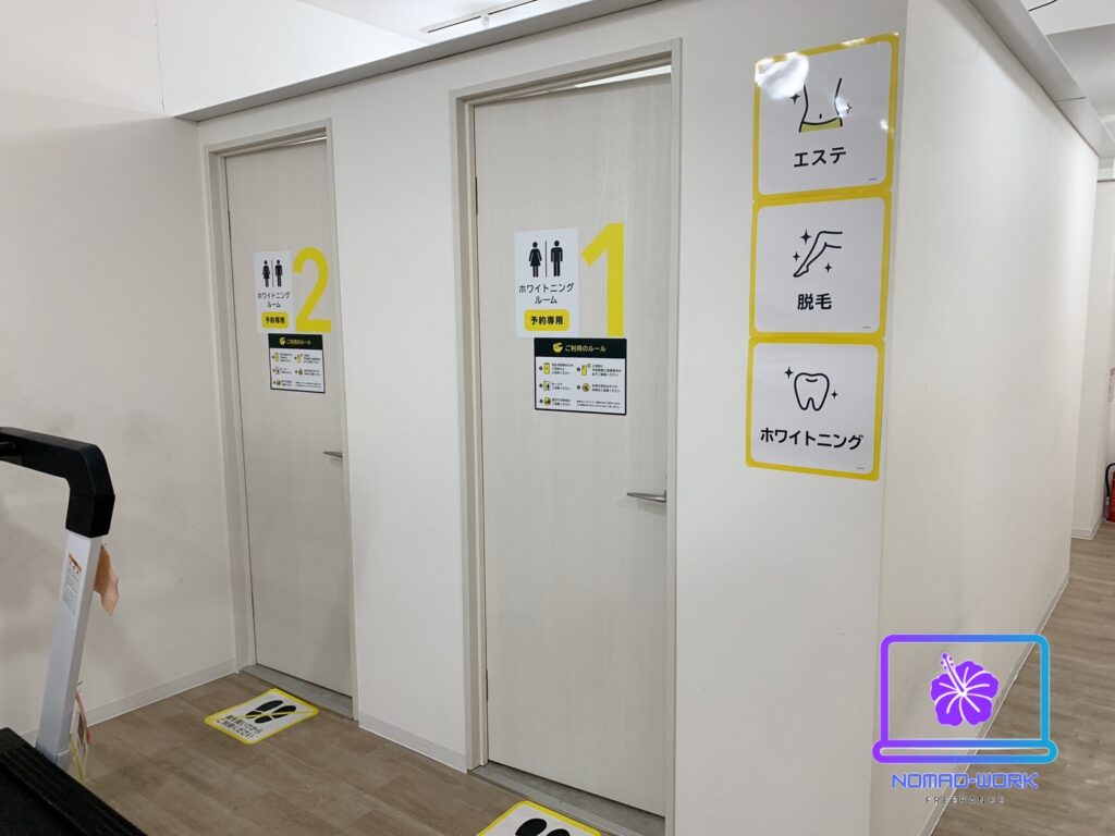 | サービス | セルフエステ(男女兼用、女性専用) セルフ脱毛(男女兼用) セルフホワイトニング2室 ネイル デスクバイク マッサージチェア ランドリー ピラティス |