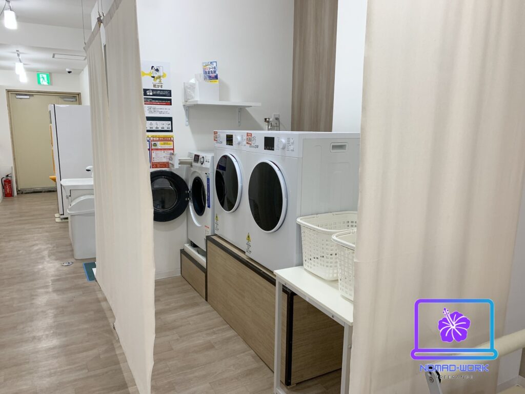 その奥には洗濯機と乾燥機。故障はしておりませんでした。(2025年12月現在)出張の時などには便利ですよね!