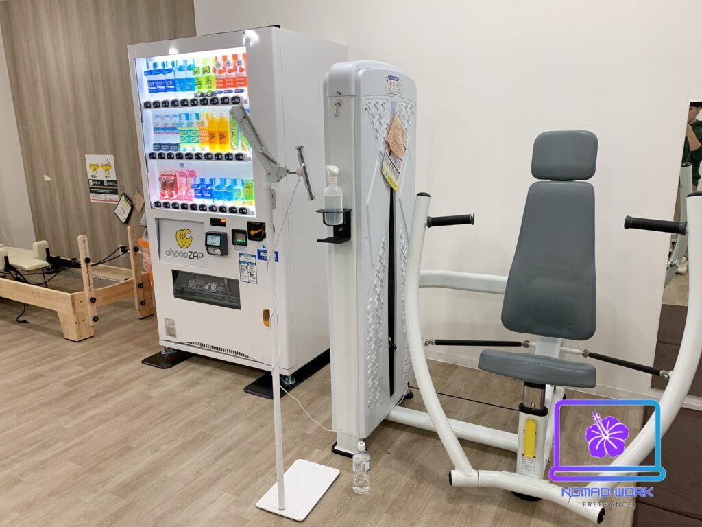 ストレッチスペースの隣にはチェストプレスが一台あります。そしてこの銀座中央通り店には自販機もついています。ドリンクを忘れてしまった時などには便利ですよね!チョコザップの店舗によっては自販機が無い場所が多いので、増えればいいのになと思います。