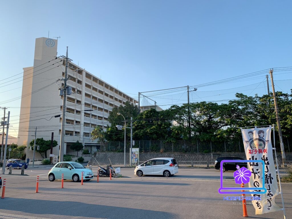 店舗の前には首里高校の野球場があります。隣にはファミリーマートがあります。敷地もゆとりがあり広めな感じですね!