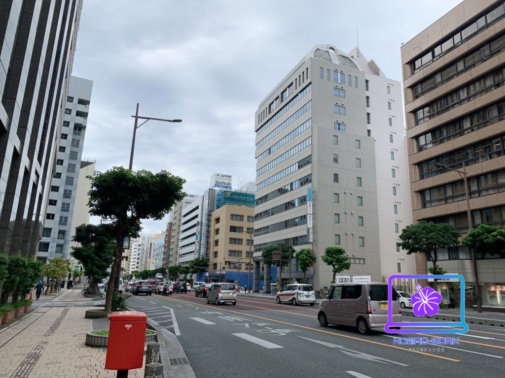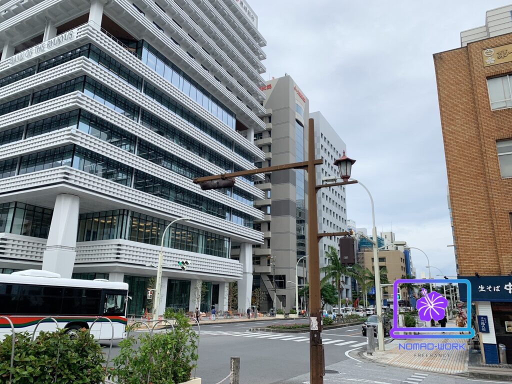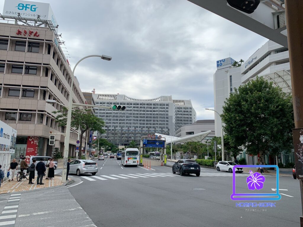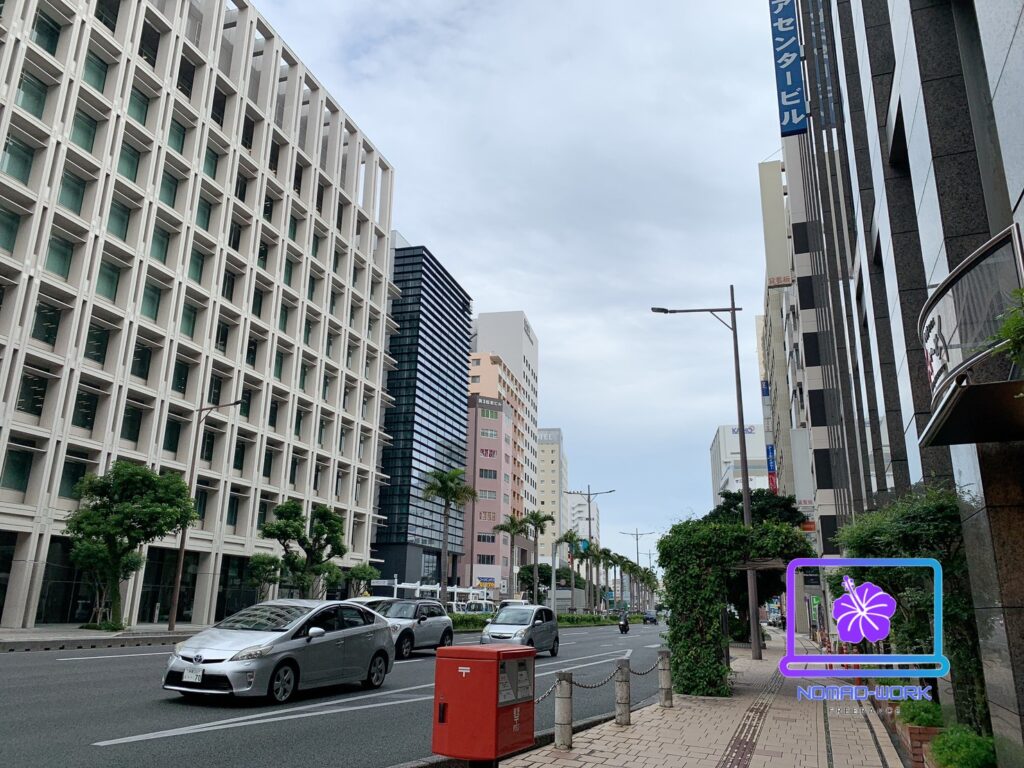 こちらが58号線の様子。オフィスビルが立ち並んでおり、かなりの大通りです。大通りに出たら、北方面に向かい3分ほど歩くとchocoZAP(チョコザップ)沖縄県庁前店が見えます。