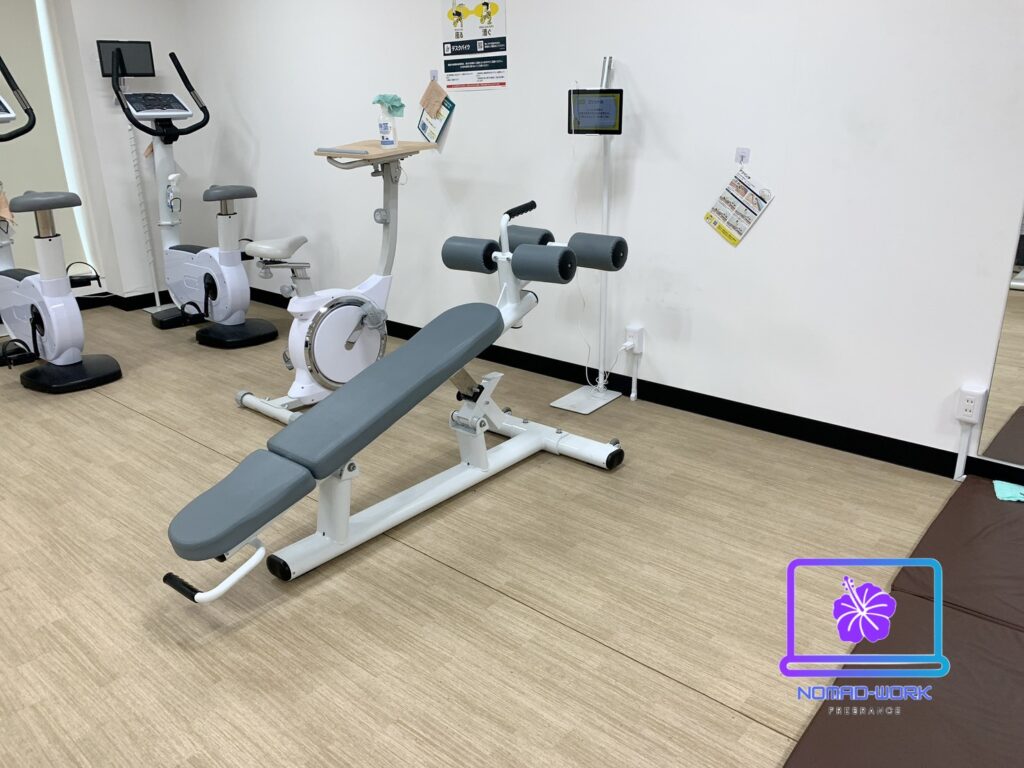 バイクの後ろにはアブベンチと横にはストレッチスペースがあります。こちらも器具の故障はなく使用することができました。