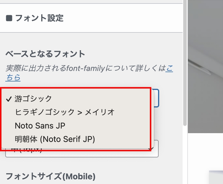 スクロールするとベースとなるフォントという場所があるので、そこから選択することができます。