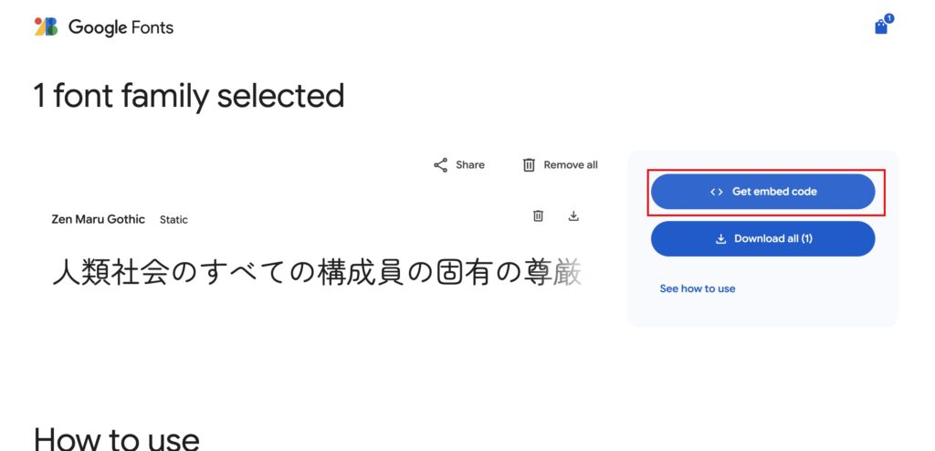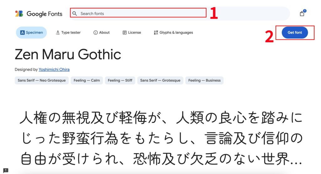 次に検索バーの箇所で指定したいフォントを検索します。因みにこのブログで使用しているフォントは「Zen Maru Gothic」になります。その後に青いボタン「Get font」をクリックしましょう。