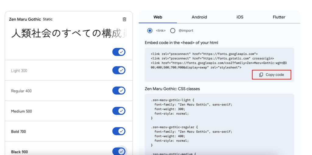 次に上段のEmbed code in the <head> of your htmlのコードをコピーします。Copy codeと書かれている場所をクリックするとコピーができます。左側にあるLight300、Regular400などは文字の太さを表しています。取得したい文字の太さにチェックを入れましょう。