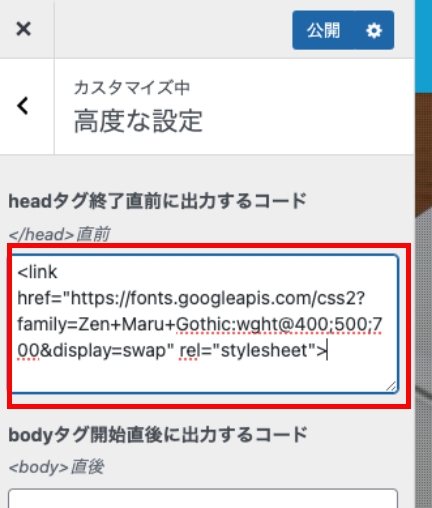 5.GoogleFontsのコードを高度な設定></head>内に貼り付ける