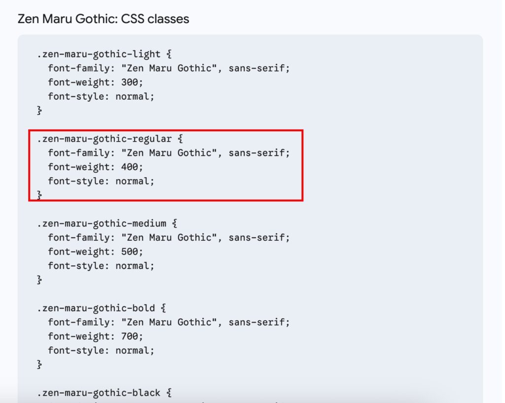 次にGoogleFonfs内の下段にあるCSSを貼り付けていきます。たくさんCSSがありますが、個人的にはfont-weight:400;のコードが良いかと思います。こちらをコピーします。