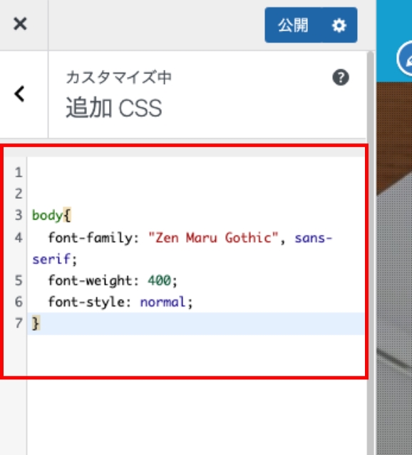 GoogleFontでコピーしたCSSをこちらに貼り付けて公開ボタンをクリックしましょう。