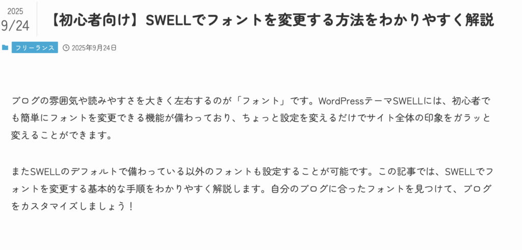 いかがでしたか?SWELLでは特別な知識がなくても、管理画面から簡単にフォントを変更することができます。フォントが違うだけで、ブログやサイト全体の雰囲気がぐっと変わりますよ!
