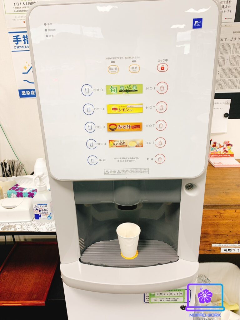 ネオワーク岐阜ではドリンクも飲み放題です。種類は緑茶、レモンティー、味噌汁、コンポタ、水、コーヒー(ドリンクサーバーの隣にあります)になります。個人的には味噌汁とコンポタが飲み放題だったのは嬉しかったです。