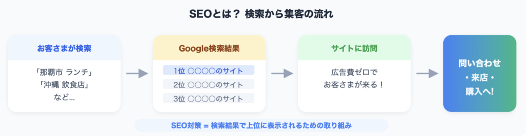たとえば「那覇市 ランチ おすすめ」で検索した人に、あなたのお店のページが表示されたら?それがSEOの効果です。
