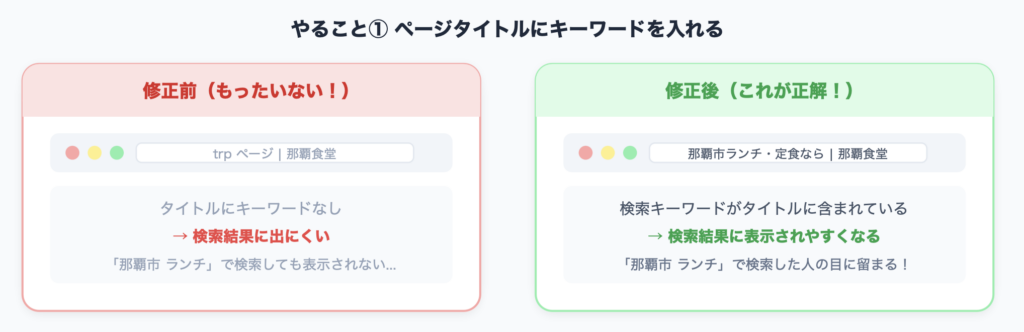 SEOの中でも、最も効果が大きく、今すぐできる改善がタイトルの見直しです。