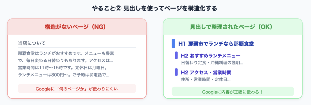 ページの内容をGoogleに正確に伝えるために、「見出し」の活用も重要です。