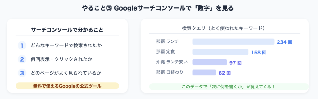 難しいテクニックを追いかけるより、タイトルの見直し・見出しの整理・サーチコンソールの確認、この3つを地道に続けることが、長期的には一番効果的な近道です。