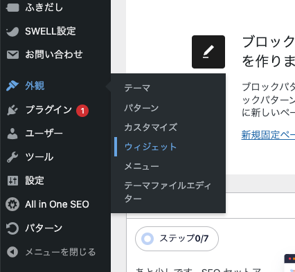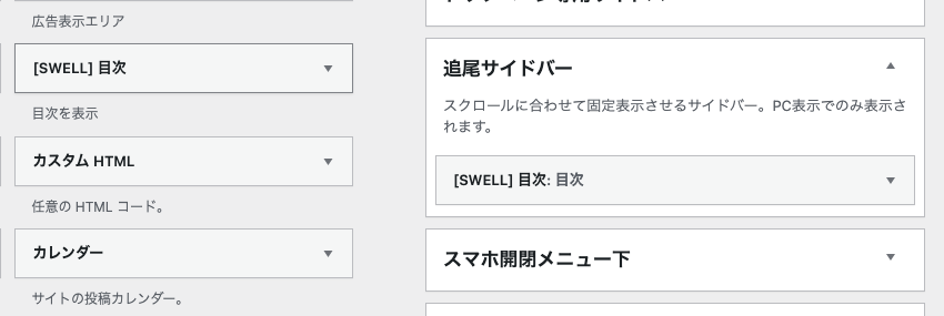 ウィジェット画面が表示されたら、右側にある「追従サイドバー」の箇所に、左側にある「SWELL」目次をドラック&ドロップで持っていきましょう!