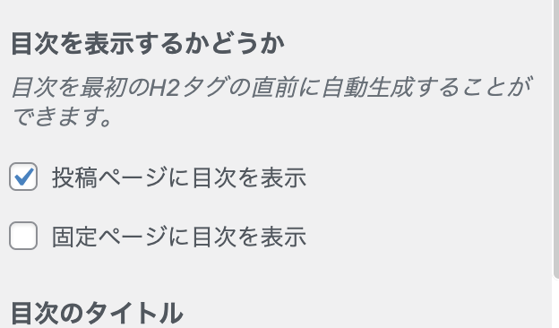 投稿ページか固定ページに目次を表示するかどうかを選択することができます。デフォルトでは、「投稿ページに目次を表示」にチェックが入っているかと思います。記事に目次が表示されない方はこちらにチェックを入れましょう。固定ページとは、サイト内でどのカテゴリにも含まれない、独立したページのことで、ブログメインでサイトを運営している人はプライバシーポリシーページがこの固定ページに該当するかと思います。基本的に、固定ページには目次は不要かなと感じるのでこちらはチェック項目を外しましょう。