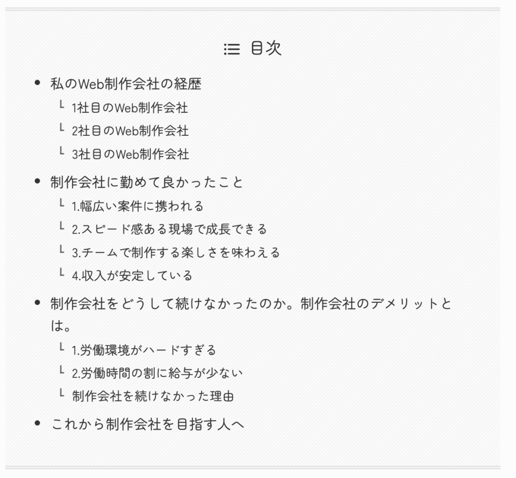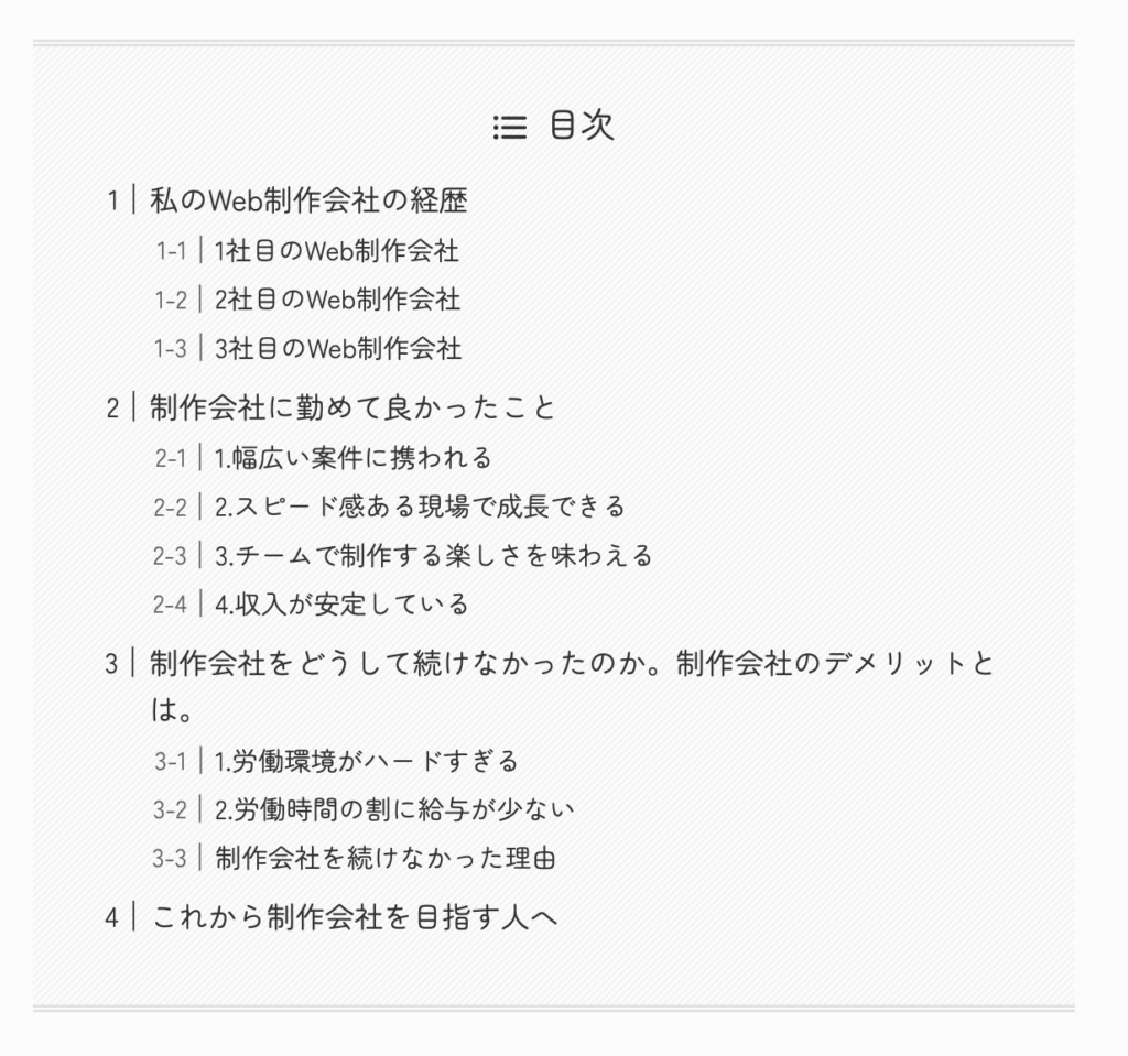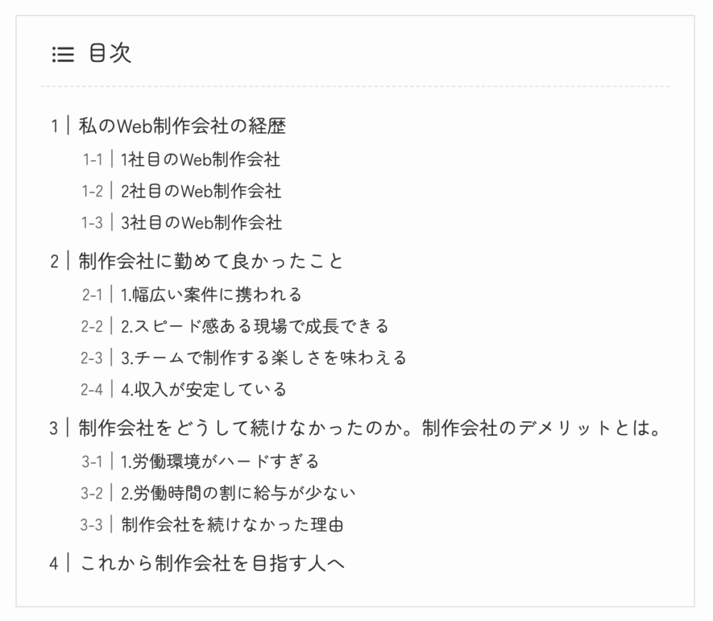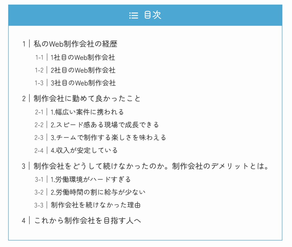 olタグは番号付きの目次、ulタグはドット付きの目次が表示されます。