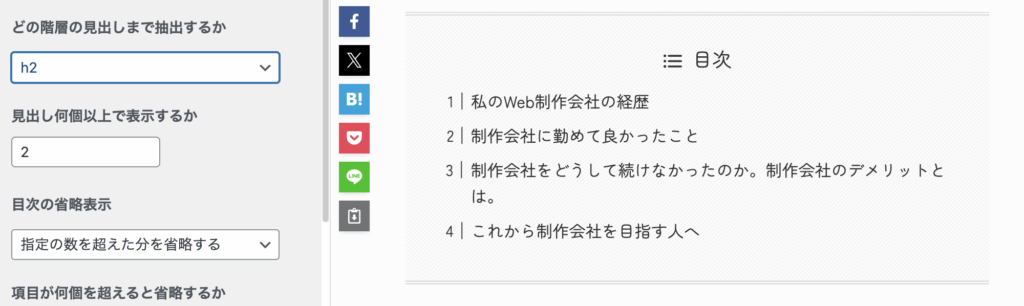 どの段階の見出しまで表示させるかも設定できます。こちらが仮に「h2」に設定すると以下のようになります。
