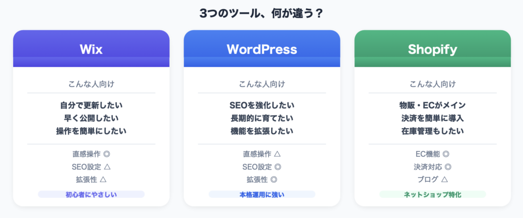 ShopifyはEC(ネットショップ)に特化したプラットフォームで、決済機能・在庫管理・配送設定などが最初からセットになっています。物販がメインの事業であれば、WordPressにプラグインを追加するよりもShopifyの方がシンプルで使いやすいことが多いです。