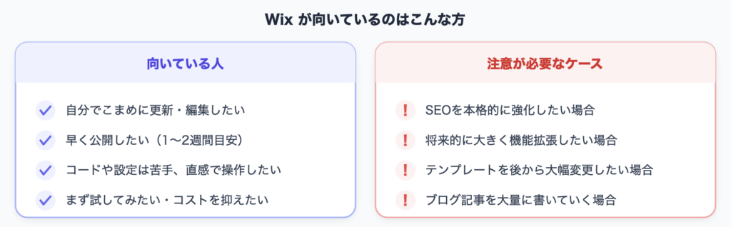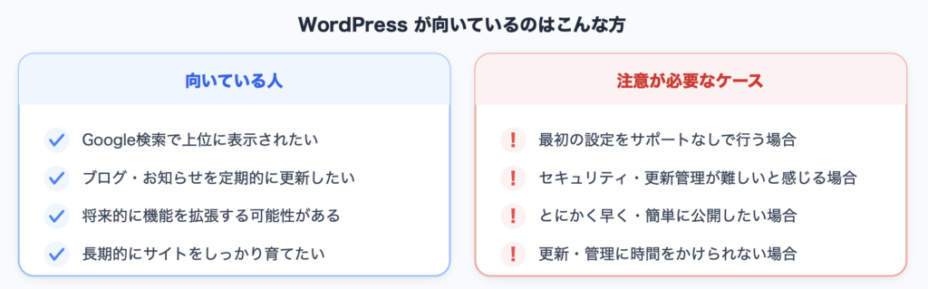 ただし、デメリットもあります。初期設定がWixより複雑で、セキュリティの管理やバックアップなどの運用が必要になること。慣れるまでに時間がかかる方も多いです。