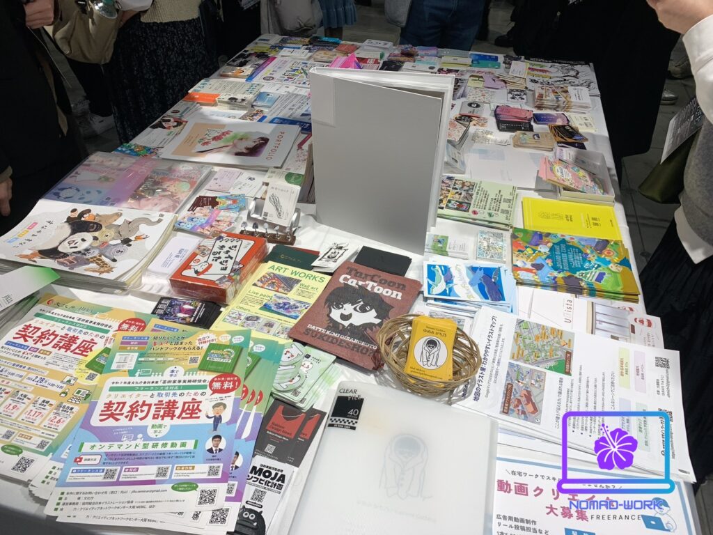 名刺を置くスペースがあり、本当に多くの名刺やパンフレットがありました。そして会場に参加している人同士で交流もできました。